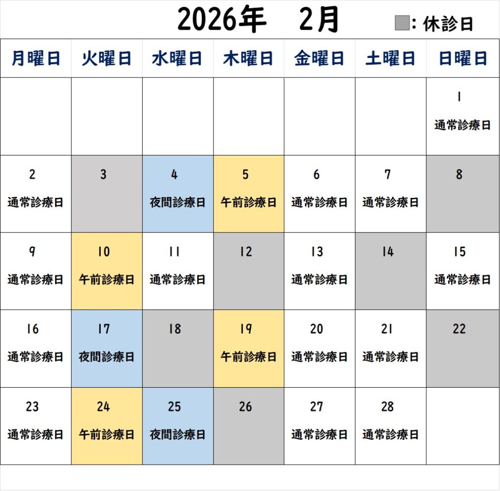 こんにちは!姪浜駅前矯正歯科です☺2月の診療日は下記カレンダー通りです!